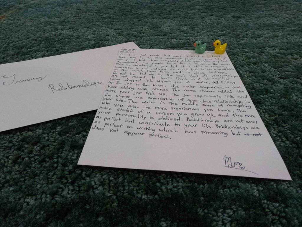 The fact that people drift apart is hard to understand. They may be the most important people in one point but then completely ditch you. You may feel abandoned, but people leave for a reason. The reason may be unrelated to you but it is still a reason. Closeness is not defined or rigid but is as unpredictable as the wind. Time flies and so does feelings. Do not be fed up by the fact that all relationship are not meant to last. Think of it as another stone dropped into your jar of water, filling up the jar to the brim. The water evaporates, so you keep adding more stones. The more stones added, the more your jar fills up. The jar represents life and the stones are experiences of close relationships in your life. The water is the middle zone of navigating who you are. The more experiences you have, the more stable of a person you grow as and the more your personality is defined. Relationships are not easy or perfect but contribute to your life. Relationships are as perfect as writing which has meaning but does not appear perfect.