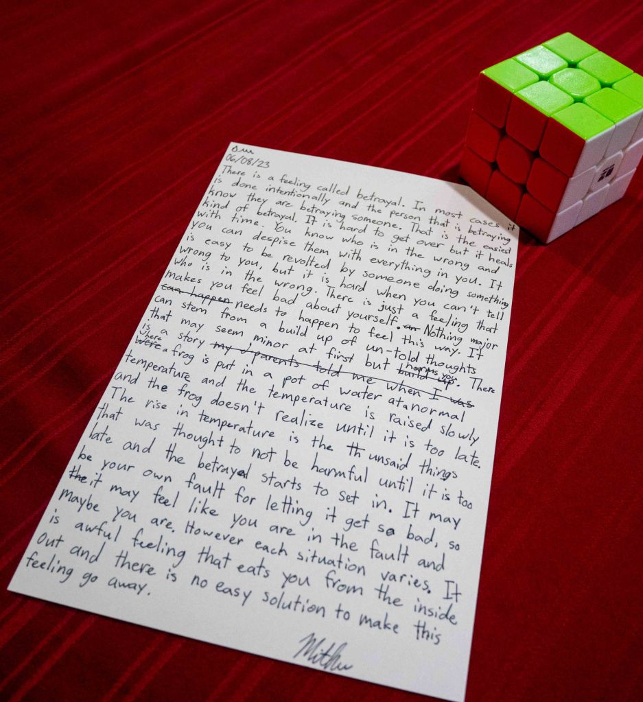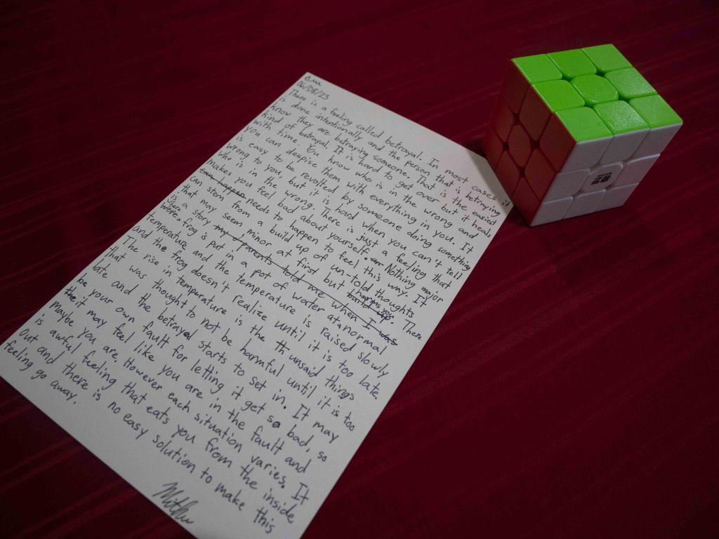 There is a feeling called betrayal. In most cases it is done intentionally and the person that is betraying knows they are betraying someone. That is the easiest kind of betrayal. It is hard to get over but it heals with time. You know who is in the wrong and you can despise them with everything in you. It is easy to be revolted by someone doing something wrong to you, but it is hard when you can’t tell who is in the wrong. There is just a feeling that makes you feel bad about yourself. Nothing major needs to happen to feel this way. It can stem from a build up of un-told thoughts that may seem minor at first but harms you in the long run. There is a story where a frog is put in a pot of water at a normal temperature and the temperature is raised slowly and the frog doesn’t realize until it is too late. The rise in temperature is the the unsaid things that was thought to not be harmful until it is too late and the betrayal starts to set in. It may be your own fault for letting it get so bad, so it may feel like you are in the fault and maybe you are. However each situation varies. It is an awful feeling that eats you from the inside out and there is no easy solution to make this feeling go away. I have tried.